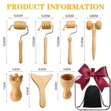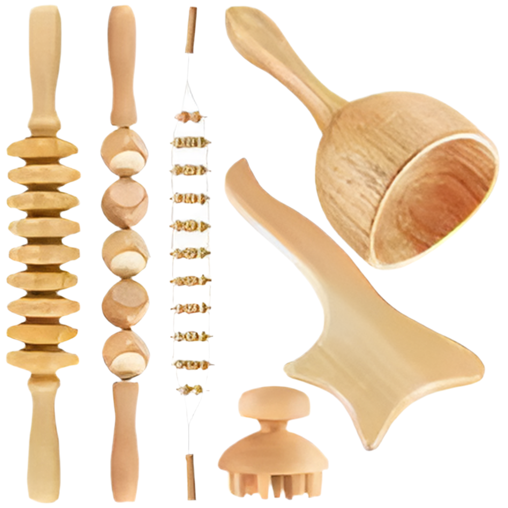 Composé d'outils en bois naturel, il permet un massage complet, favorise le raffermissement de la peau et aide à réduire l'aspect de la cellulite de façon douce et efficace.